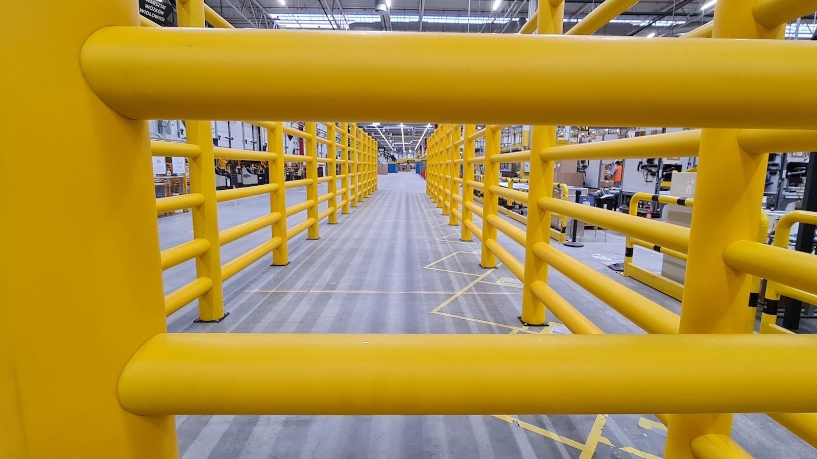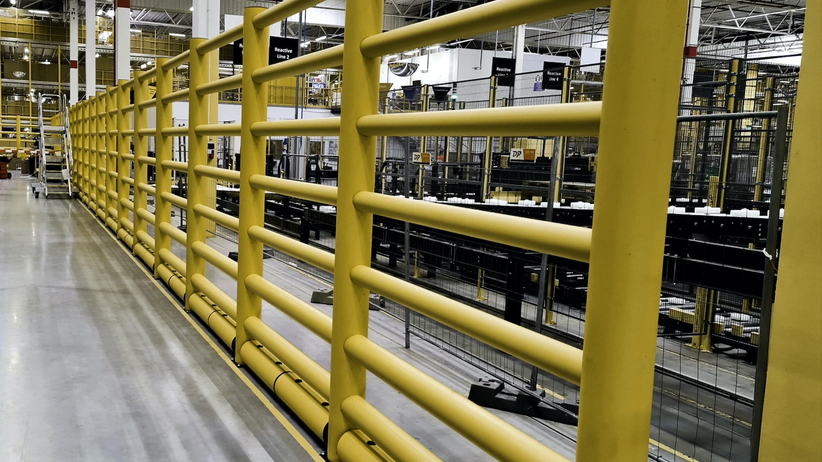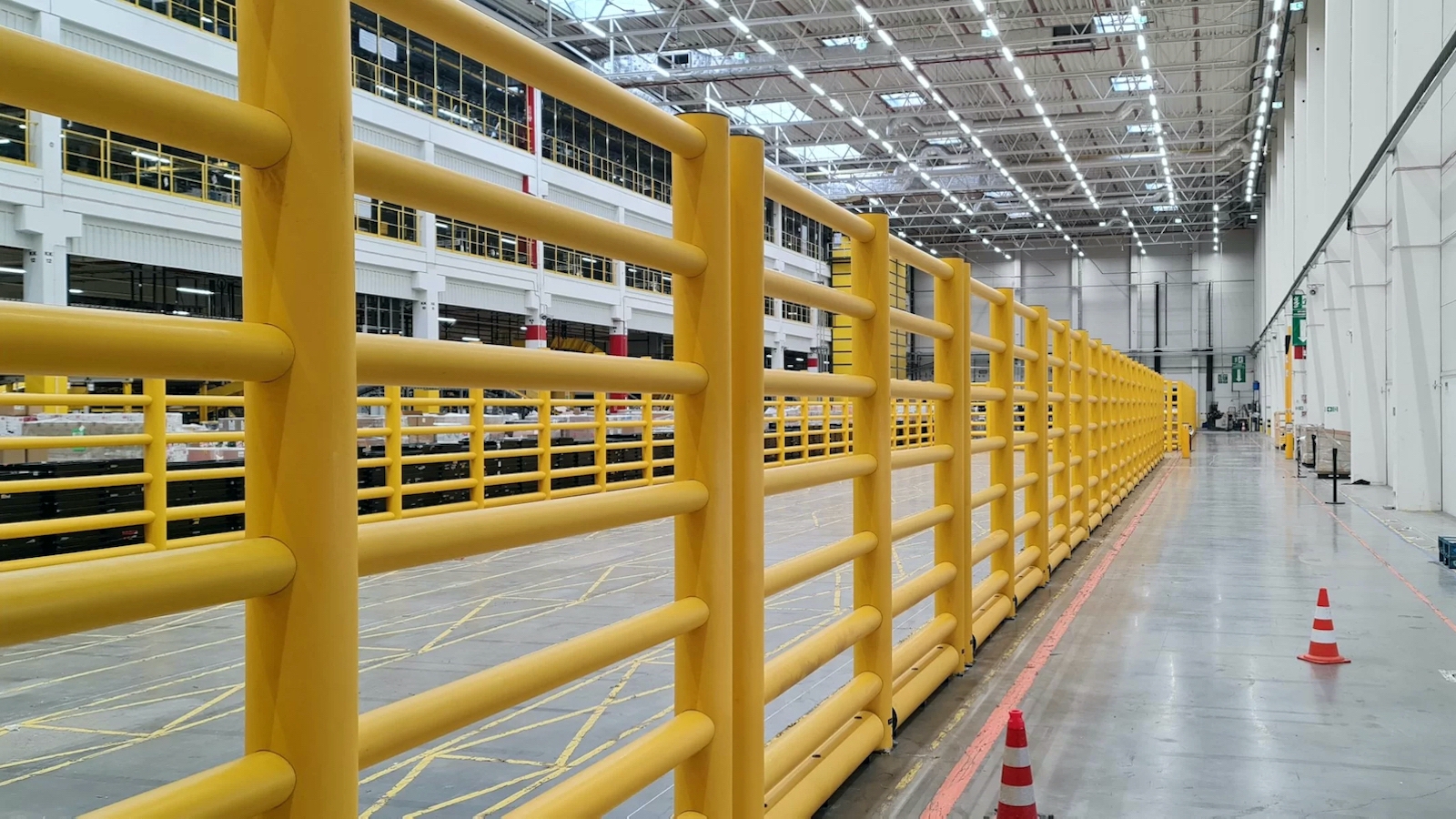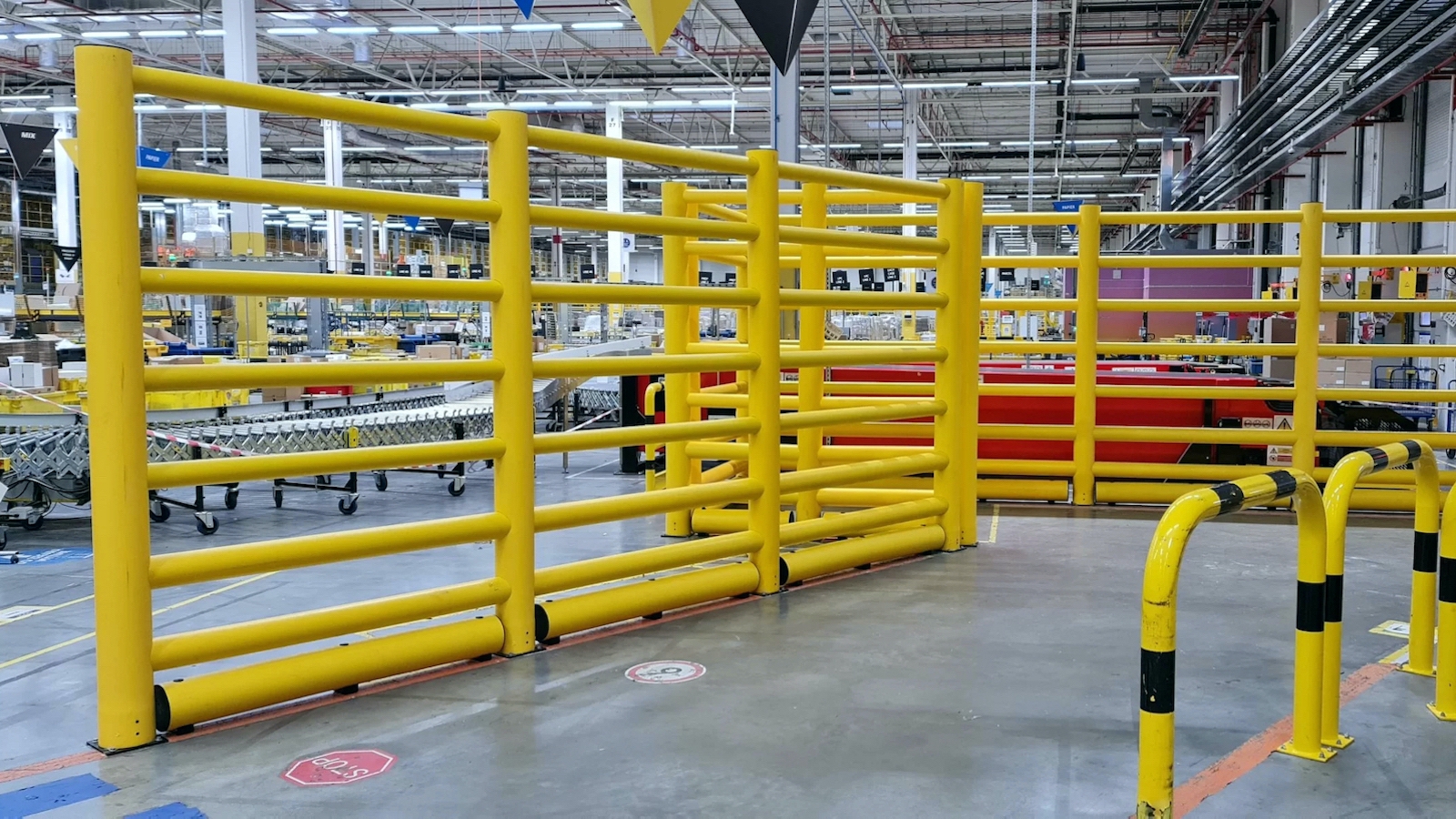 Vysoká bezpečnostní zábrana chránící chodce, stroje a vyvýšená místa pro skladování zboží